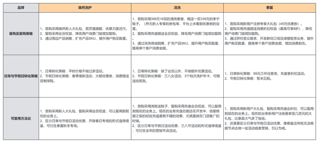 焕然洗护的春季焕新活动比较吸引人,定制球鞋也能很好的抓住用户的痛点;浣洗的三八节活动强提醒,依然是主打储值策略;泰笛未设置节日转化策略,此部分比较欠缺。