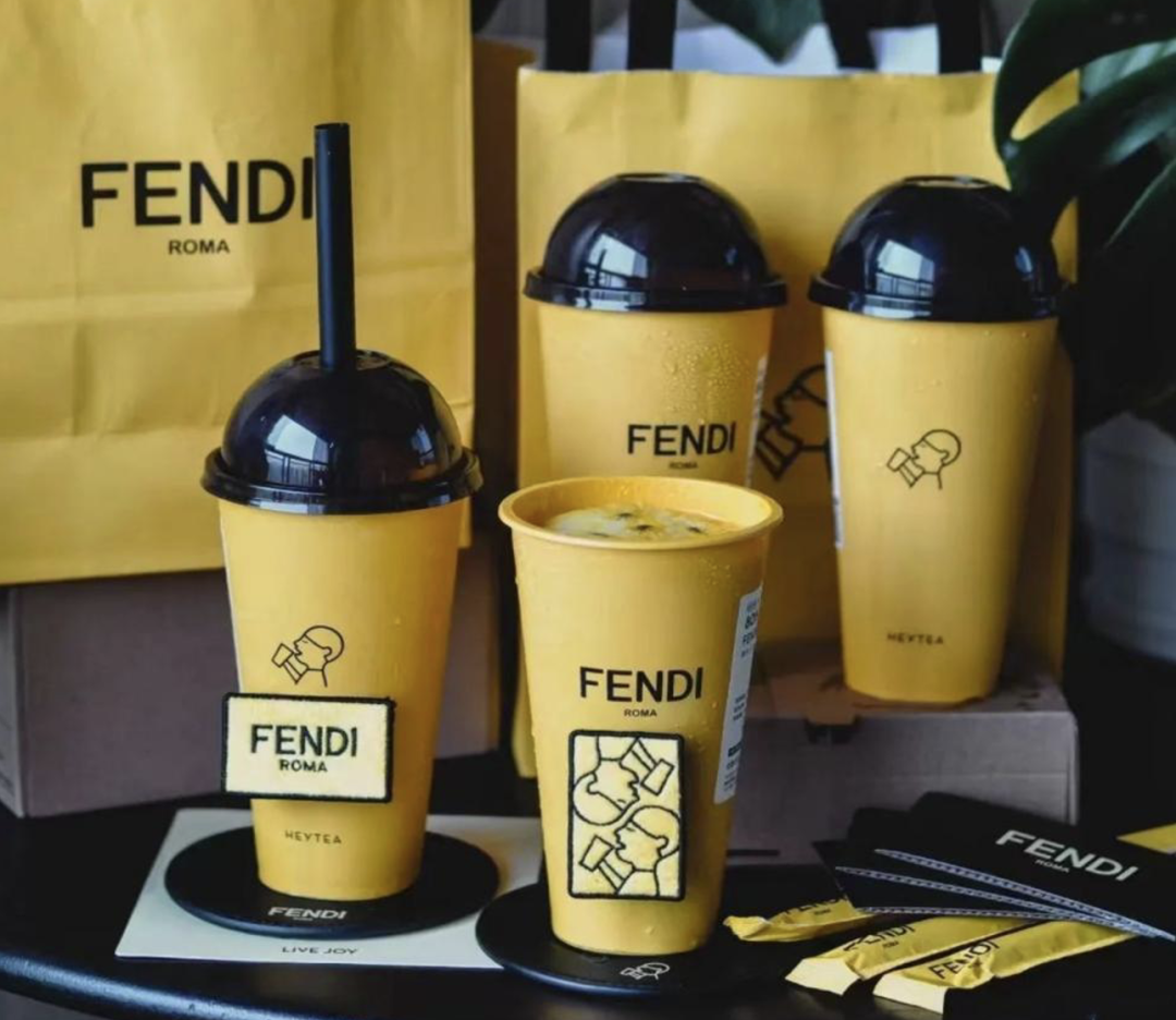 联名产品包括4款限定甜品和一款名为"FENDI喜悦黄"的特调奶茶,而真正促使消费者争相购买的是购买2杯'FENDI喜悦黄'饮品即可获赠FENDI联名杯垫或徽章,以及一个黄色FENDI手提袋的优惠,在开卖后不到半小时,多家联名周边已售罄。