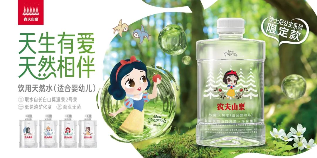 农夫山泉婴儿水选择从宝妈群体出发,通过美人鱼、白雪公主、花木兰、贝儿公主等7个经典角色,以及3款迪士尼100周年限定款,不仅为宝宝成长带来天然、健康、安全的饮用水,还让每个妈妈在陪伴孩子成长的点滴过程中,找寻曾拥有过的“公主梦”。