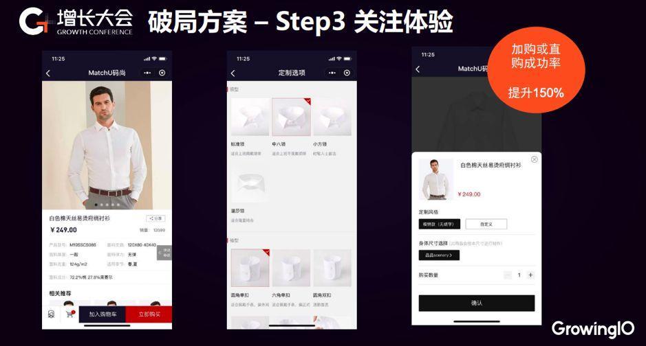 举一个用户在 MatchU 选择不同的领型定制项的案例:我们发现很多用户是小白用户,根本不知道选择这个领型或者袖型是否匹配,给他选项的时候会很茫然。我们当时模拟了用户心理,决定开放简单的小白功能,比如直接下单模特款。虽然这一功能违背了我们这项产品的初衷,但我们还是尊重用户本身的需求,功能优化后,产品加购和直购的成功转化率都提升了 150% 。