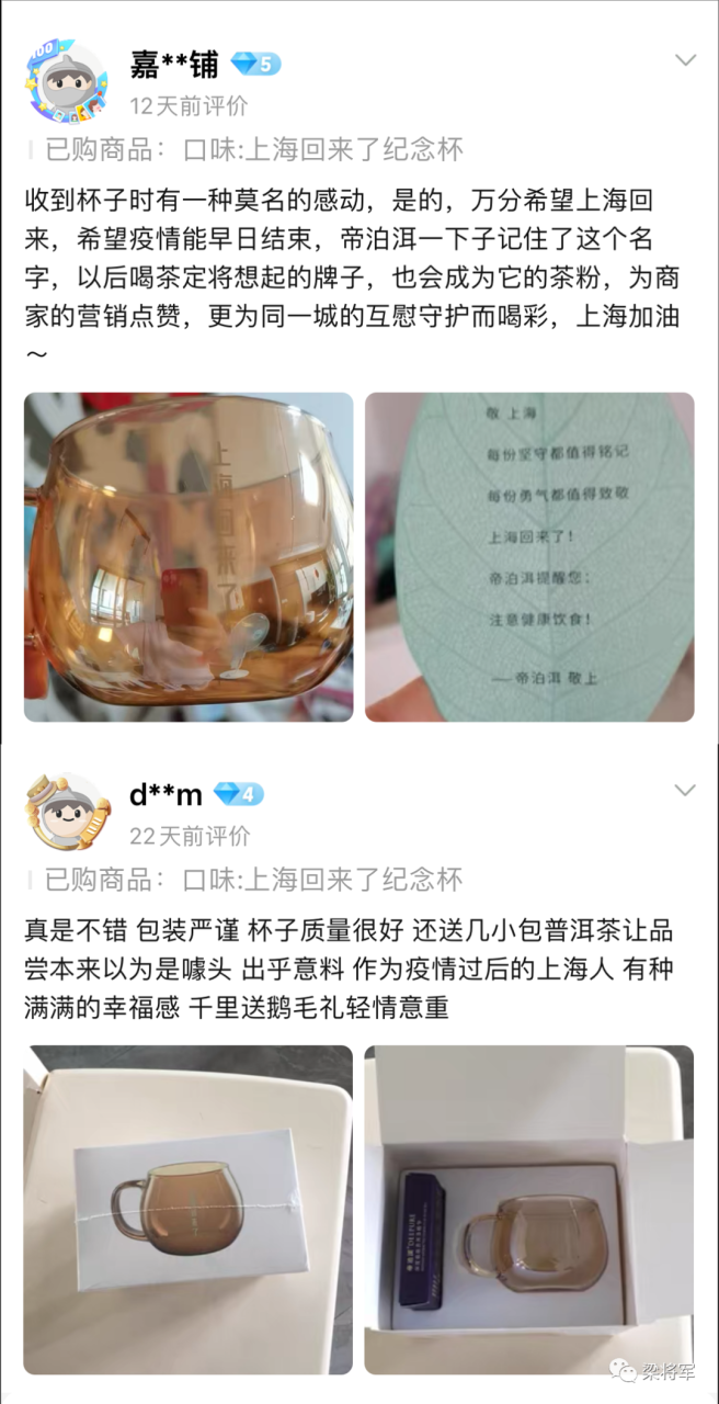 在上海宣布“上海回来了”的同一天,帝泊洱推出#帝泊洱敬上海#的微博话题,打造了20万个「上海回来了」纪念杯,免费赠送给每一位上海人民。