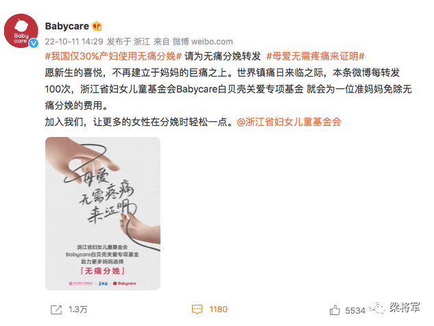 于是,Babycare在微博上发起了一个行动,叫“母爱无需疼痛来证明”,并联合了珀莱雅、屈臣氏、丝塔芙等13个品牌方,一起为女性生育疼痛发声。