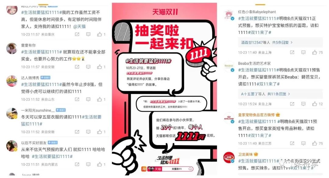 他们还发现,打工人在工作中用“1”表示“收到”,已经成为一种社交文化,于是把这个现象跟“双11”结合,发起一个#生活就要扣1111的活动。