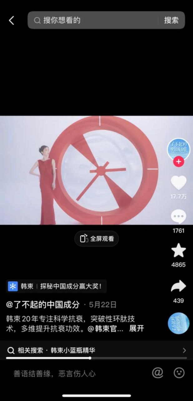 强强联合下,韩束在“了不起的中国成分”官抖合作发布了品牌“环肽”微纪录片,正式官宣这一全新自主科技成分。