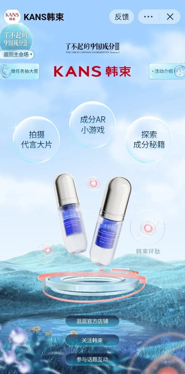 比如在活动小程序内,韩束上线了拍摄代言大片、成分AR小游戏、探索成分秘籍等互动方式,让用户在乐趣中感知韩束环肽的抗衰功效。其中成分AR小游戏,需要用户通过左右移动头部控制挡板,接住环肽成分球。简单的小互动背后,就隐藏着韩束“锁住年轻肽”价值理念的传达。