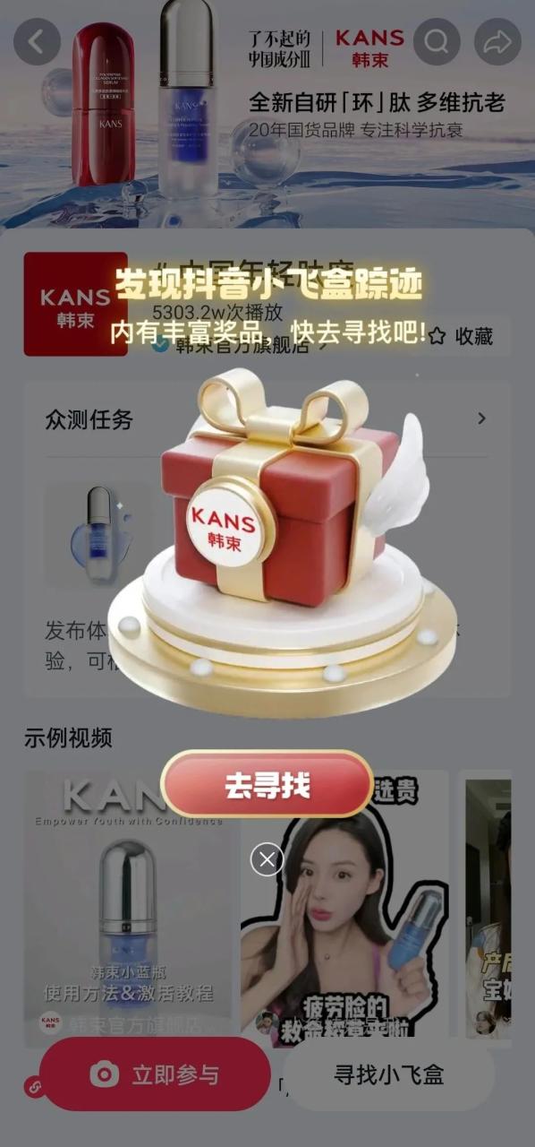 为了进一步提升活动参与度,韩束还解锁了全新的“小飞盒”功能玩法。用户只需要完成品牌的指定任务,比如浏览、点赞、评论、收藏等,就可以触发站内随时掉落的“小飞盒彩蛋”,打开“小飞盒”,即有机会获得韩束试用装、产品优惠券等惊喜福利。“小飞盒”活动充分调动了抖音用户的热情,导向销售端的奖品设置,也缩短了种草-购买路径,降低了营销成本。