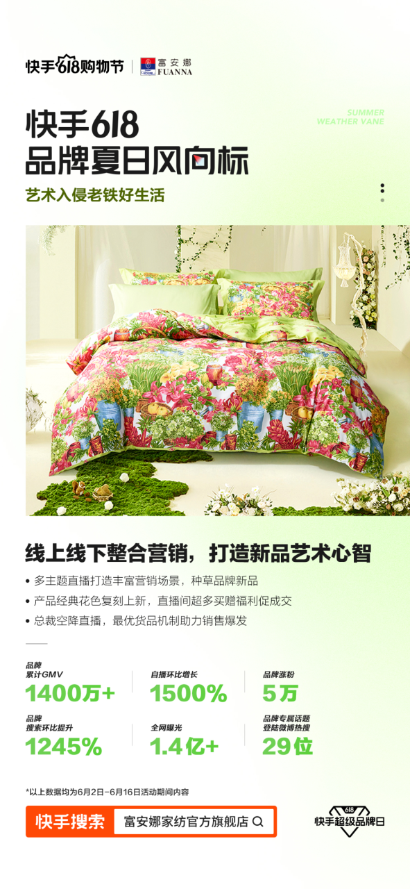 在洞察到现代人普遍具有的精神内耗、职场内卷高压情绪影响了睡眠、摧毁了身体这一现象后,富安娜聚焦当下睡眠的“困”和“扰”,与快手电商联合策划了#夏日入侵 主题活动,通过线上线下联动,逐步传递消费者“好睡眠选富安娜”的品牌印象。
