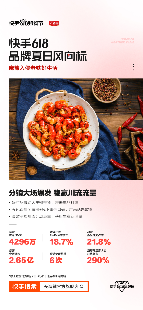 与富安娜不同,生鲜品牌天海藏在快手的核心基本盘是达人分销,从2019年入局直播后就与各头部主播建立了密切合作,成功打开了品牌认知度。在此次快手618,天海藏在保持分销基本盘优势的同时,充分利用川流的支持,加大了对自播的投入,保证了未来品牌经营的长线性和稳定性。