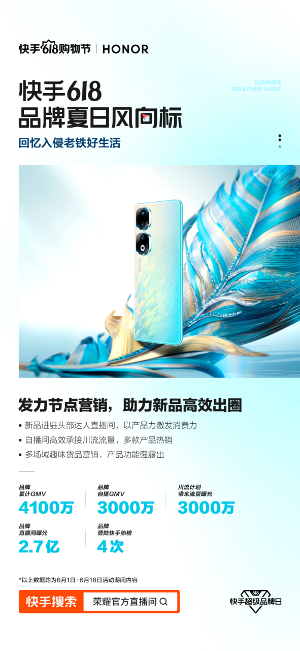 手机品牌荣耀,在快手618期间同样是自播与分销兼顾,期间拿下了4100万GMV,发布的荣耀90系列登顶快手新机销量榜。