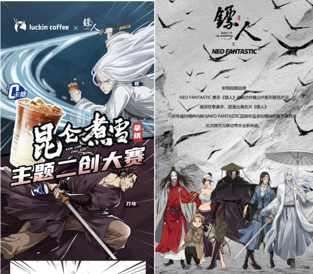 以《镖人》为例,从一开始的冷门,再到如今被人们高呼“神作”,《镖人》精良制作与极佳的口碑为IP的商业化延展奠定了坚实的基础。不仅联名瑞幸以昆仑山脉为灵感推出东方风韵特调「昆仑煮雪拿铁」,给人带来味蕾上的天山飘雪和纸绢泼墨,还携手新锐国潮品牌NEO FANTASTIC 推出IP联名款服饰,以《镖人》中侠客的狂呈现出独特有调性的国潮风,并通过定制雨伞、马克杯、鼠标垫等多元周边让用户在边“看”边“买”中实现IP与生活的交融。