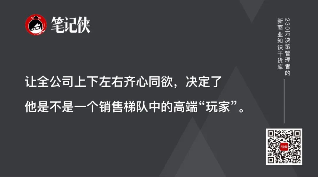能否摆脱单一部门的思维,进行跨团队合作,以及是否能驾驭业务的中长期发展,让全公司上下左右齐心同欲,决定了他是不是一个销售梯队中的高端“玩家”。