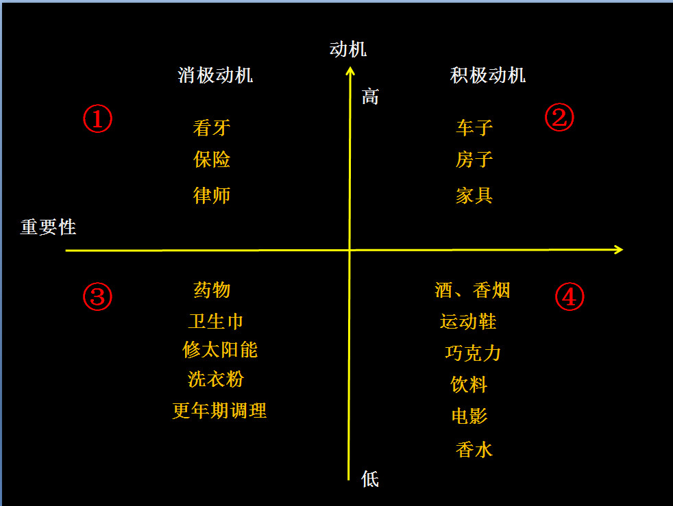 在这个象限,产品本身很重要,但是人们的动机却是消极的,比如:保险、去看牙医、去找律师。