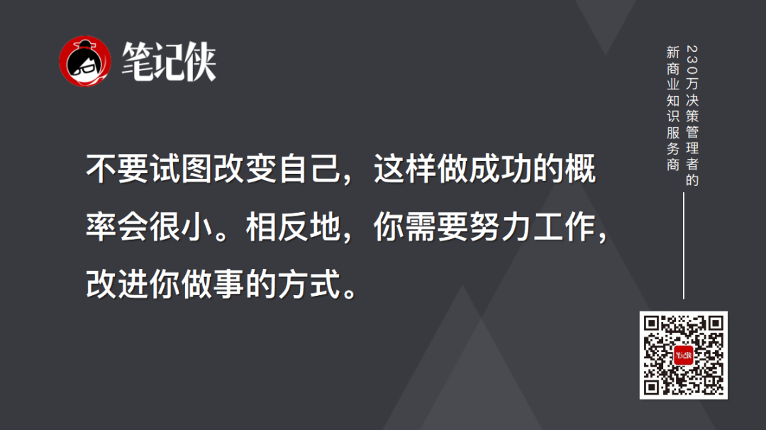 切记:不要试图改变自己,这样做成功的概率会很小。相反地,你需要努力工作,改进你做事的方式。不要采用你做不到的或做得不够好的方法工作。