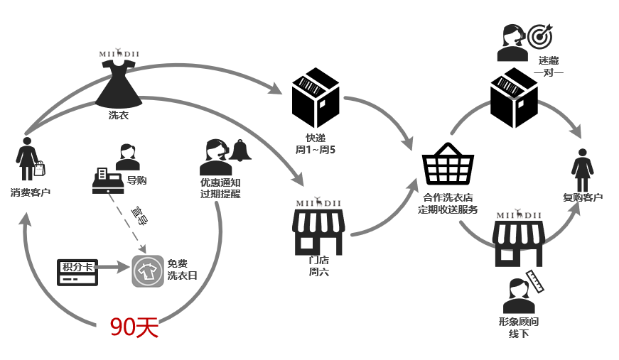 比如针对离店90天的用户,会在提供给顾客(即时需求的)便利的基础上进行激活 ,在季度更替时会派发免费洗衣券,用户兑换积分就能免费洗衣。顾客可以选择送到门店或线上快递,我们都有相应的人员跟进。