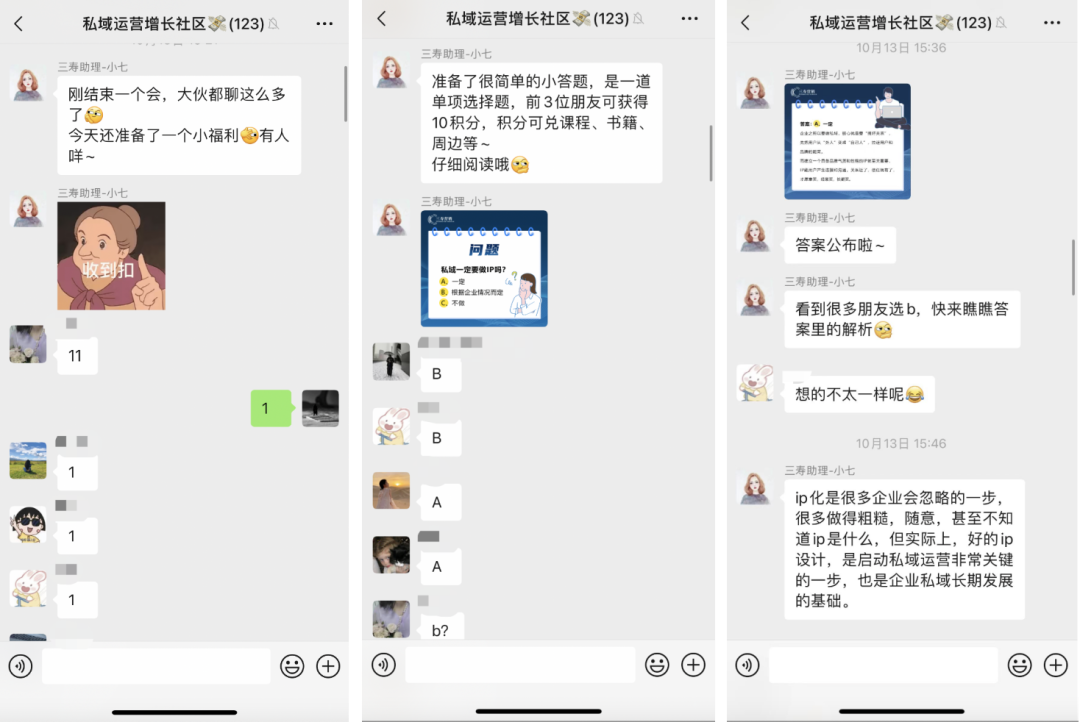 趣味答题:由群主设置一个难度较为简单的题目,设定答题时间,引导用户在群里发答案,用户答对后可获得奖品、优惠券、积分等奖励。