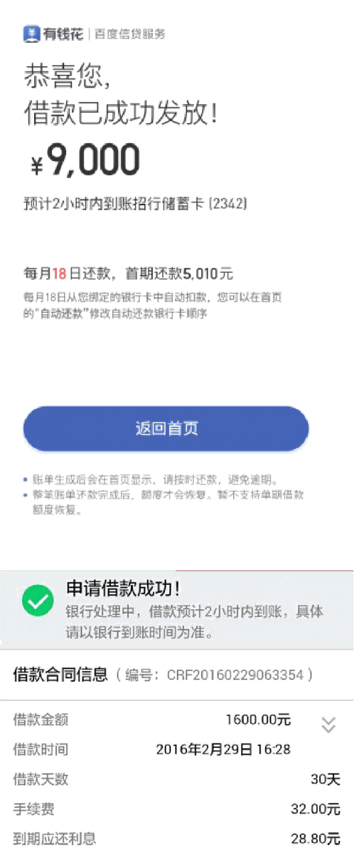 两种产品,申请流程都是纯上线模式,当日申请当日放款。比较方便。(部分需要人审电审的借款模式不在此范围内。)