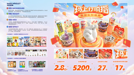 于是,一个用于圈定Z世代人群的有趣的爆梗机制诞生了——利用年轻人最关注的流行文化再创电商玩法,以促销机制入手,做一个激发全民参与的零食互动机制 “玛上打响指,购物车有惊喜”,并联动电商、O2O、线下、覆盖公域、盘活私域人群等,最终触达了无论是否准备在双十一购买玛氏箭牌零食的消费者。