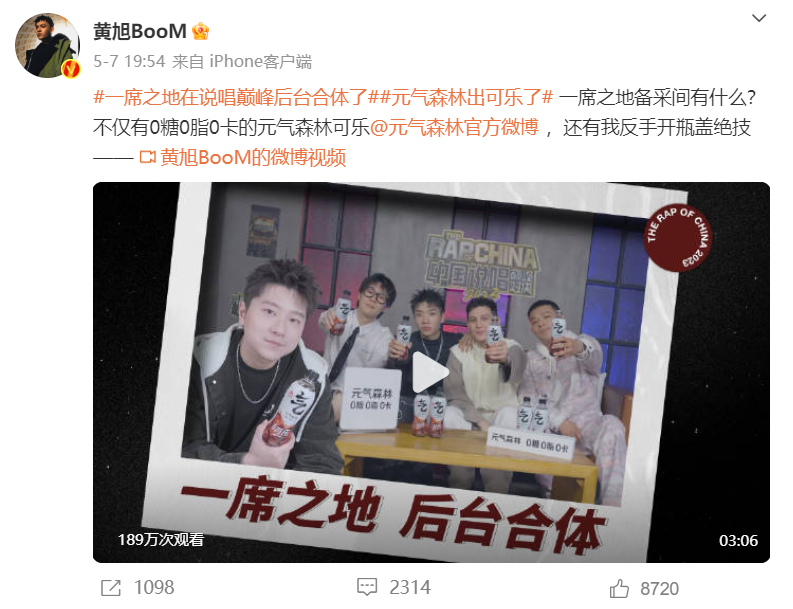 而为了加速社交裂变传播,放大品牌的影响力,同时提升粉丝活跃度,元气森林官博还发布了一个邀请广大网友分享本季最pick的homie或带#一席之地在说唱巅峰后台合体了#tag转发视频,并抽10位每人一箱元气森林新品气泡水的福利活动。这种将说唱音综营销延展至IP粉丝社交链的玩法,也提高了触达消费者的效率。