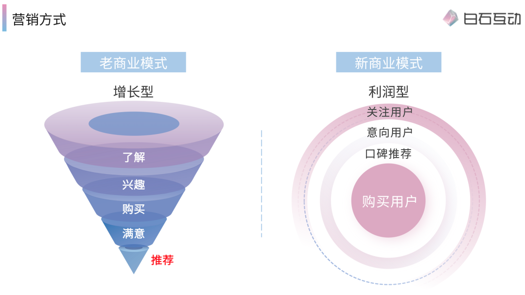 从经营目标看,从过去关注增长到现在关注利润。从营销方式看,从过去的漏斗型到今天的涟漪型。