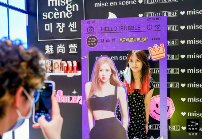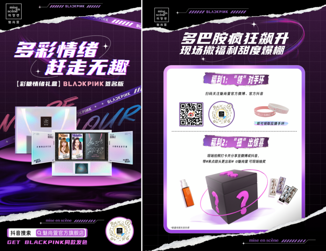 在线下场景,锚点520节点,魅尚萱打造“彩糖萱发站”,BLACKPINK四位成员人形立牌+产品介绍+品牌露出,搭载活动内场扫码关注领应援手环、发博扭蛋抽奖等玩法,吸引5000+爆满人流现场互动,成就全新“吸粉”地标。