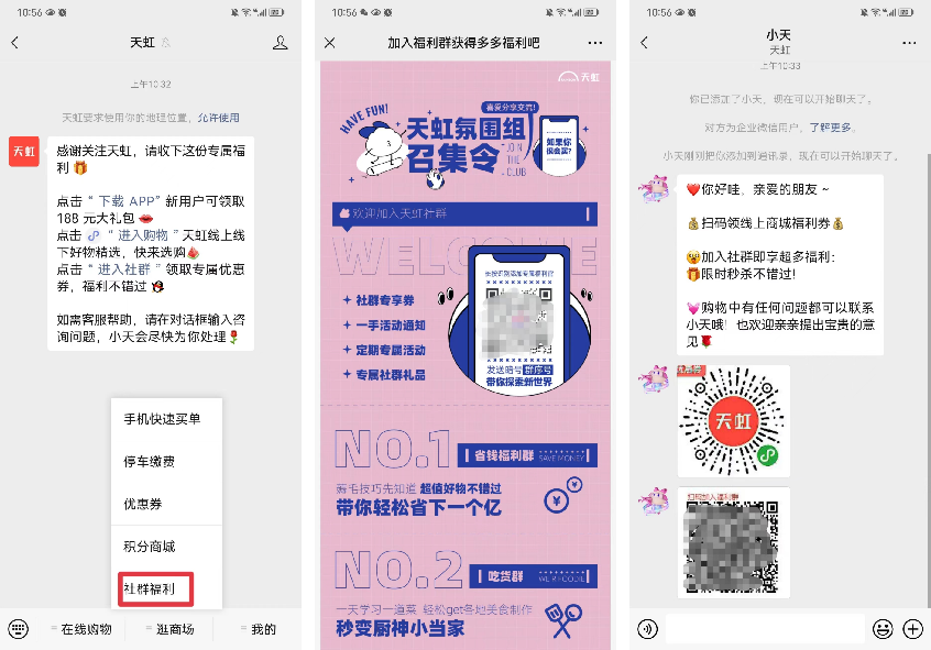 「天虹」公众号在欢迎语、菜单栏中都设置了社群的引流入口。