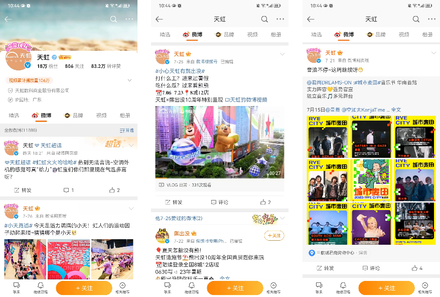 天虹在微博的粉丝数为18万,其微博发布数量更是达到11880条。目前天虹的微博更新频率为每天至少1条。