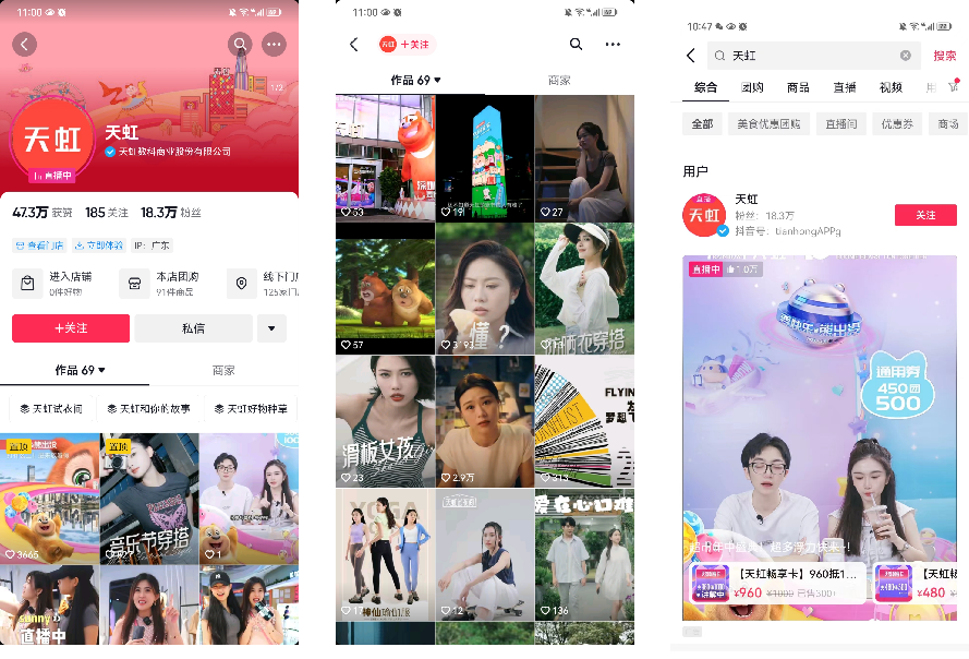 主账号「天虹」会定期开启直播带货,主页还设置了线下门店的引流入口,以及2个粉丝群的运营。视频包括品牌宣传,直播切片等。
