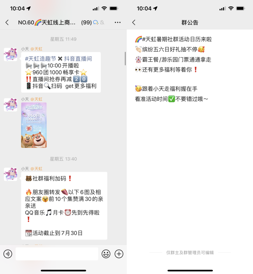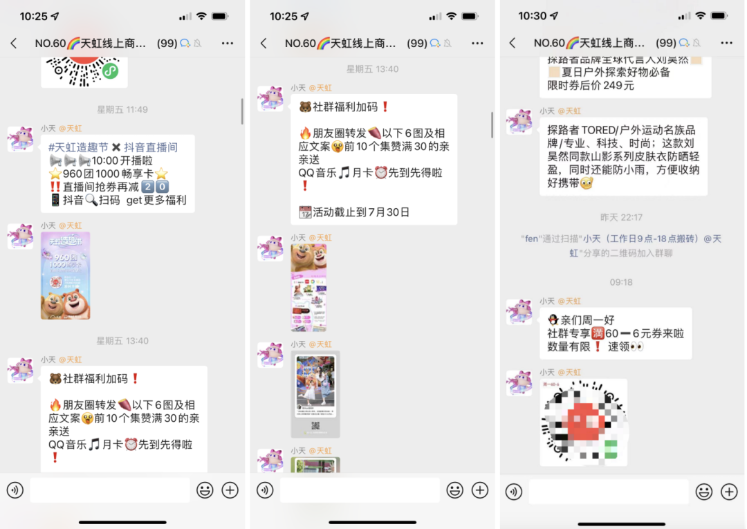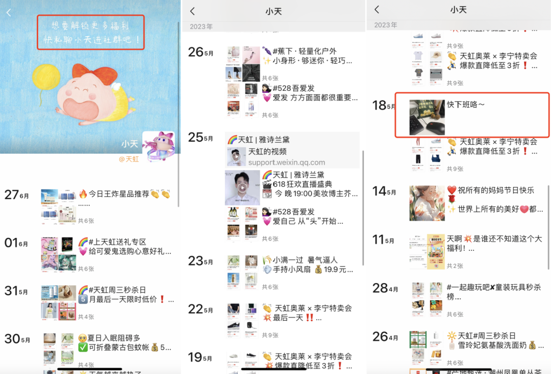 天虹的社群整体发布的频次不是很多,大概为1天2-3次,但内容类型较为完整,有福利,有引流,还有种草,例如: