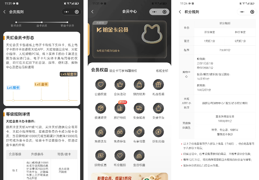 目前天虹会员分为3个等级,等级越高权益越多,具体要求及权益内容如下: