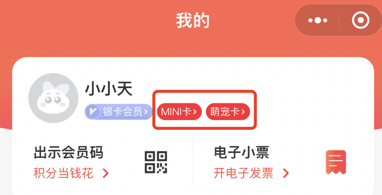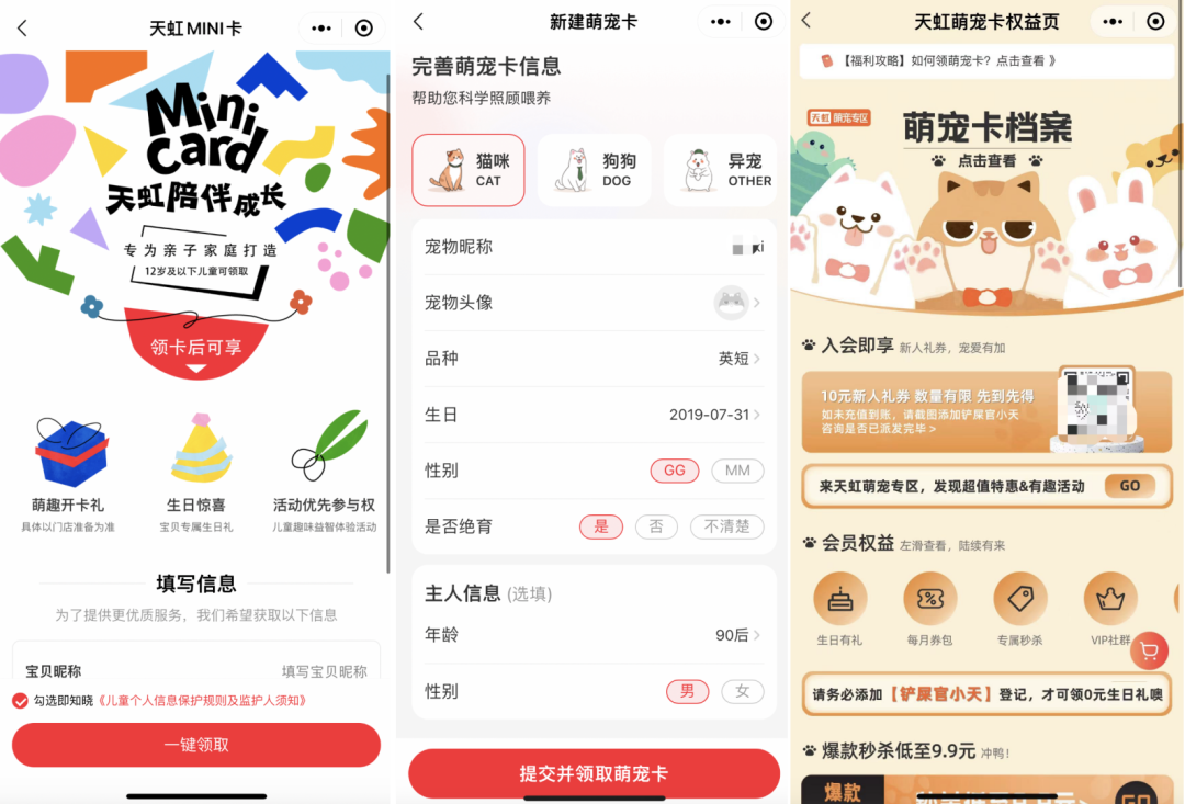 在会员卡旁边还两处不同类型的权益卡入口,一个是针对亲子人群的「MINI卡」,一个是针对养宠人群的「萌宠卡」。