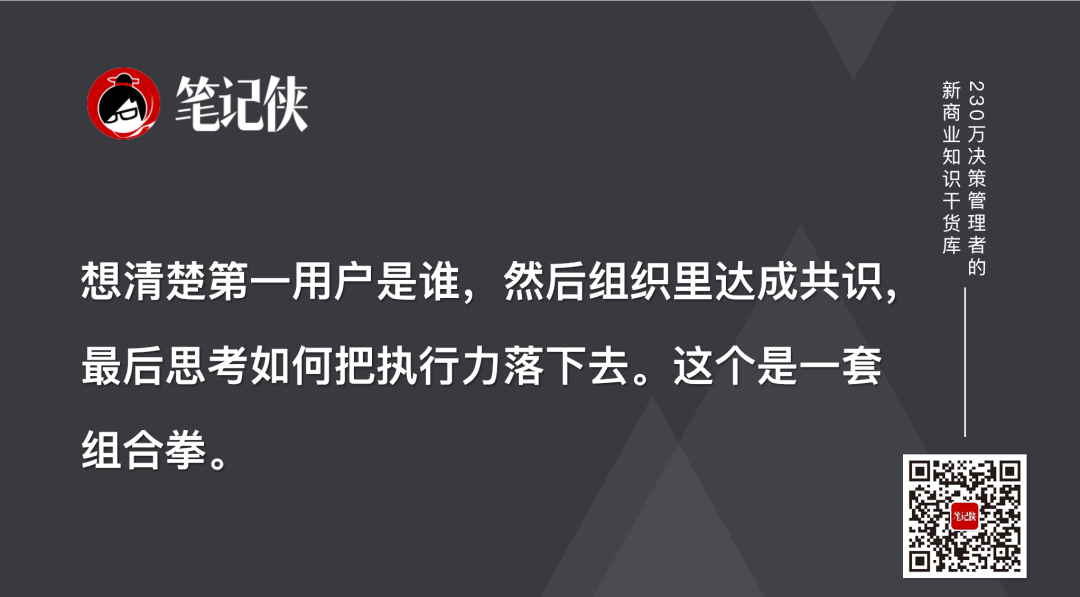 想清楚第一用户是谁,然后组织里达成共识,最后思考如何把执行力落下去。这个是一套组合拳。