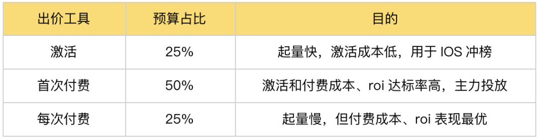 不过首发期可以适当投一下“激活”的浅层目标,预算占比25%。尽管一般“激活”目标的用户付费能力偏弱,但成本足够低,可以帮助游戏快速起量冲榜。