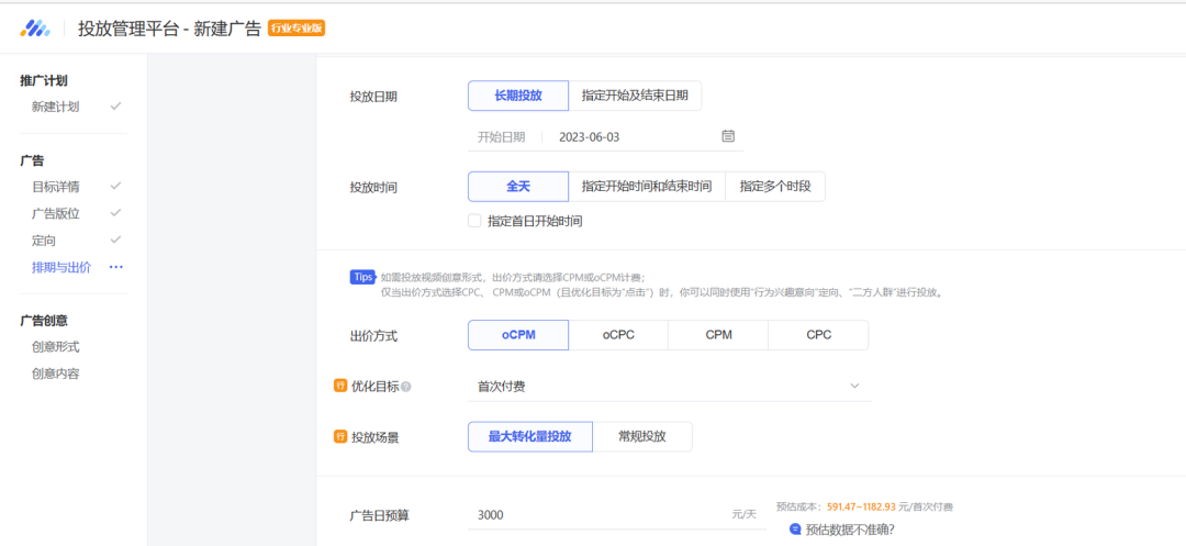 操作流程也很简单,新建广告——选择广告版位、定向、投放日期&时间——投放场景选择【最大转化量投放】——设置广告日预算后即可。如下图: