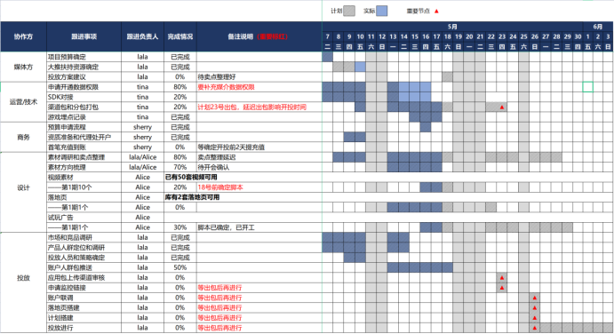 在首发前,我们务必要检查清楚各项事宜是否妥善准备就绪,可以制定一个项目排期表。详细罗列出每一个时间节点需要跟进完成的工作和对接方、负责人,包括运营、技术、设计、商务、投放侧等同学。