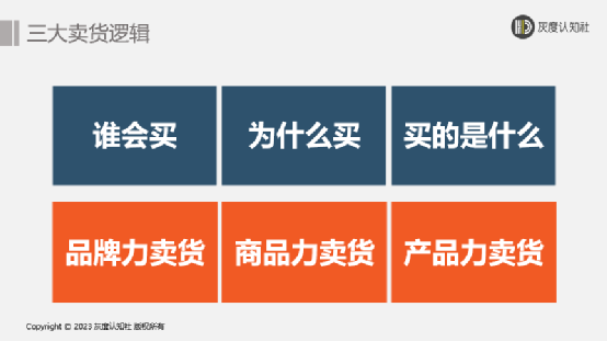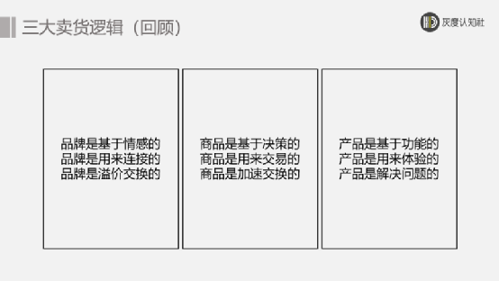 我们把销售三大痛点一一拆解,然后对应到三个卖货逻辑:品牌力卖货、商品力卖货、产品力卖货。