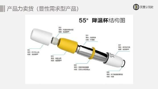 当保温杯进入产品过剩时代,客户需求和使用场景开始细分。理论上说,保温杯需求很多,有保100度的,也有保0度的,也存在保50度左右的。55度杯就是典型的显性需求型产品,应用场景就是倒热水后想快速喝到水的场景,比如开车时。