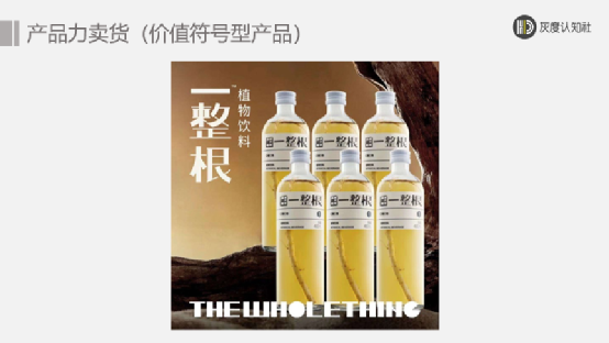 受法律限制,很多产品不让乱说功效。那怎么办呢?创造一个价值符号,比如人参是不需要教育的,国人一看就懂。那视觉上能看到,正规名字叫“一整根”,俗名叫“人参水”,再主打一个细分市场“熬夜水”,虽然啥也没说,没说逻辑没说原理没说功效,这不也可以热销么?
