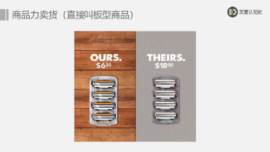 Dollar Shave Club作为一个新的剃须刀品牌,直接叫板当年市场份额高达72%的吉利剃须刀。不仅直接通过“6美元”和“18美元”的对比强化高性价比,同时还直接指出吉利为什么卖18美元,是因为他们把95%的钱都花给了费德勒(广告代言)。最终通过直接叫板的方式成为美国网络销售排第一的剃须刀品牌。