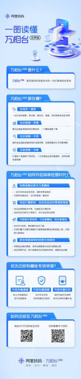 比如在万相台无界版,各个渠道的账号与资金的统一,实现最大化串联产品。此外,万相台无界版整合店铺全渠道投放效果报表,提高全店投放的效率和直观性。对于这点我深有体会,从5个人看5个后台,到1个人即可掌控,这是平台升级带来的组织升级。