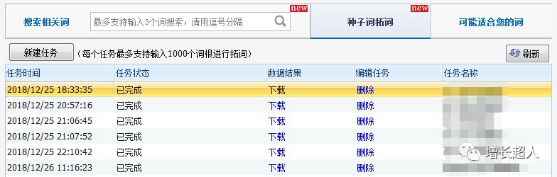 其中「种子词拓词」可以新建任务后,将种子词输入进去系统会自动拓展,并且可以直接下载关键词。