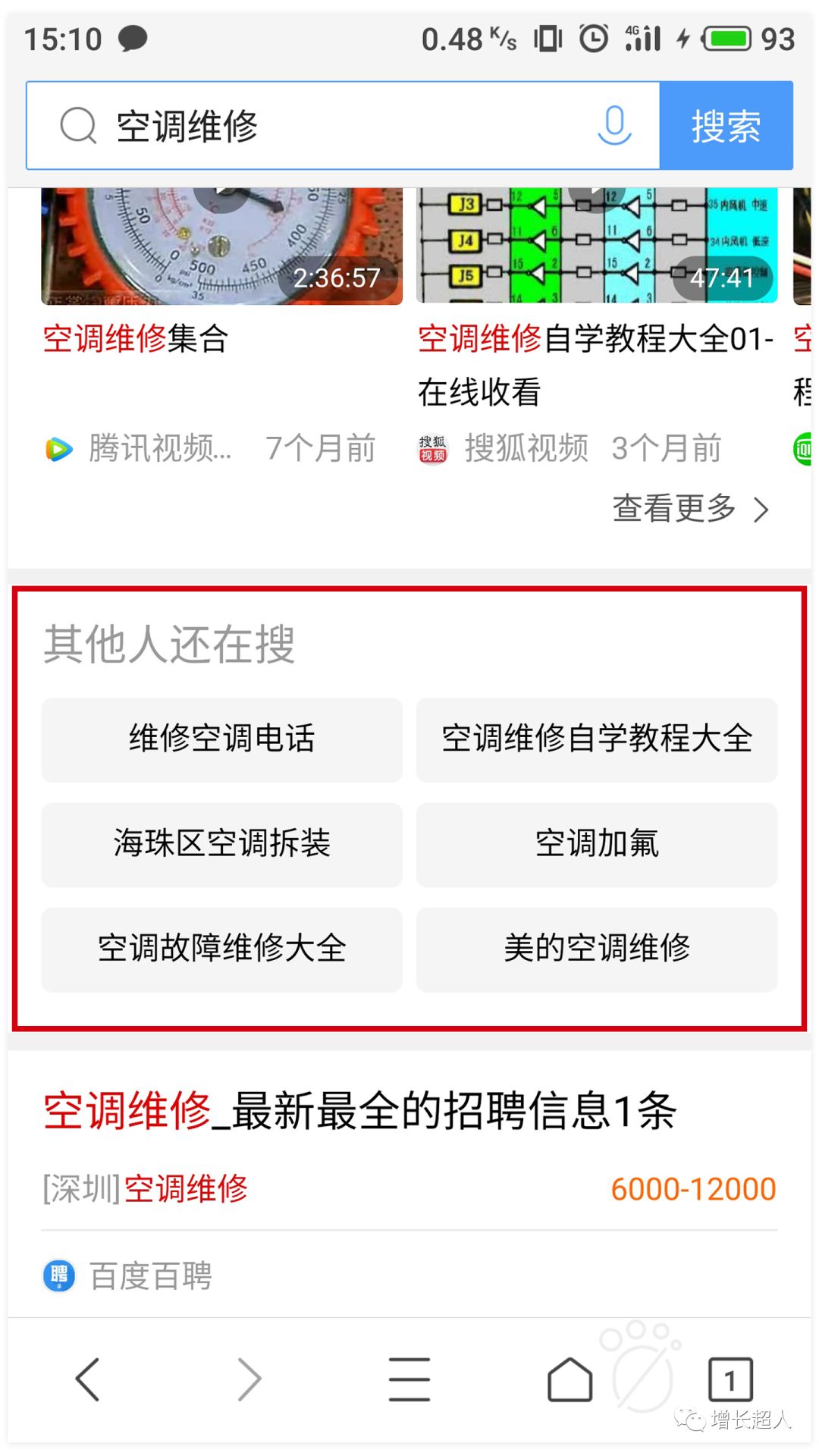 用户在看完搜索结果后并没有想点击的内容时,看到搜索结果末尾的相关搜索,会选择与自己需求相关的关键词进行再次搜索。我们选择其中与我们业务相关的词,能有效地匹配到更多优质的流量。还有移动端的其他人还在搜: