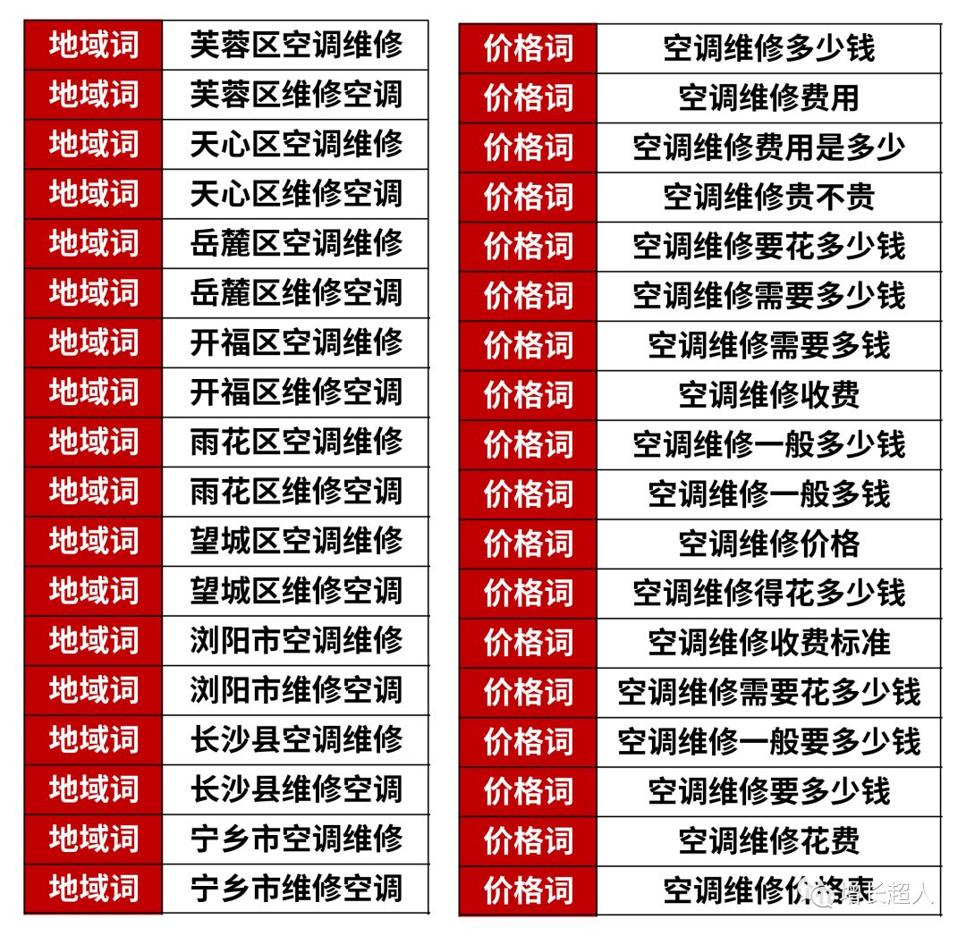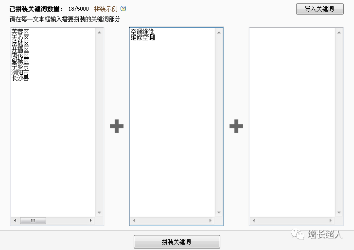 往往我们的地域词都是从关键词拼装工具拼装出来的,比如以长沙市各区的空调维修业务为例子: