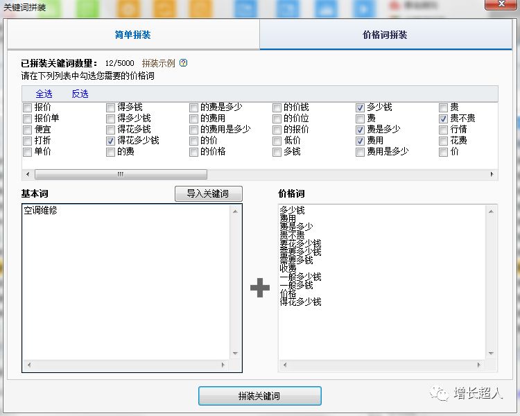 在「价格词拼装」中,有系统推荐的网民常用的搜索价格的词根,帮助我们快速拼装价格词。