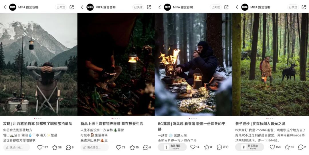 于是回到对 MIFA 的关注,在它首款露营产品上市的 2022 年 8 月,恰逢国内露营文化近几年的高潮。7 月,MIFA 开设了名为「MIFA 露营音箱」的小红书官方账号,为新品上市做预热。除了第一篇为攻略性质的好物推荐集合外,此后大部分均为博主提供的精美或视频,背景有新疆高山草甸、川西雪山、丽江原始森林,主题涉及到 BC 露营、露营 SOLO、荒野美食、雪地露营等。