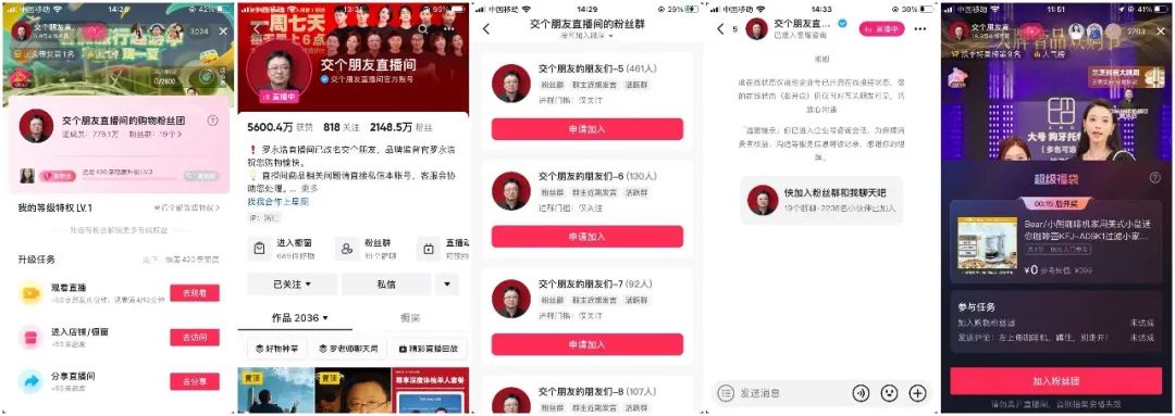 1)12个直播间头像旁点关注后,点击小爱心即可免费加入交个好友直播间购物粉丝团(里面可以做任务升级粉丝等级特权);