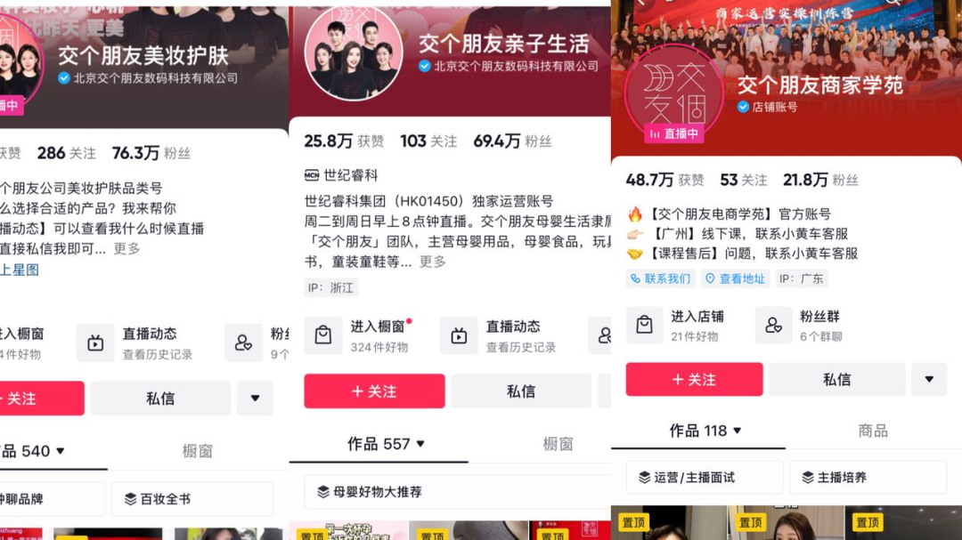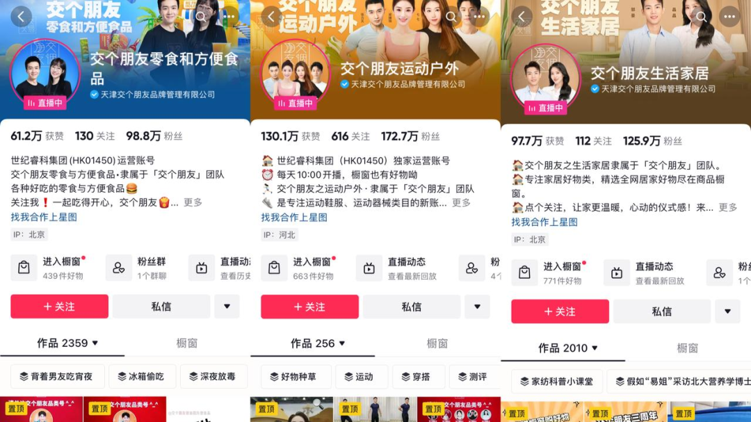 交个朋友直播间在抖音上有十几个分类账号,如:交个朋友(潮流服饰、生活家居、零食和方便食品、酒水食品、美妆护肤、亲子生活等等,实现了头部和中腰部的分层运营,在抖音平台上进行着常态化的直播。