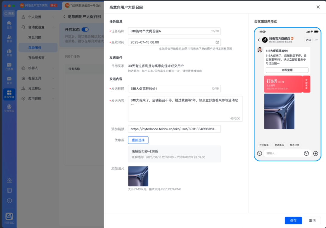 在介绍新功能前必须要提及的是“高意向用户大促召回”功能的概念。这是一款能够帮助商家在大促期间主动发送营销信息的导购工具,针对店铺内咨询却未下单的高意向用户进行主动营销,推送大促活动信息。