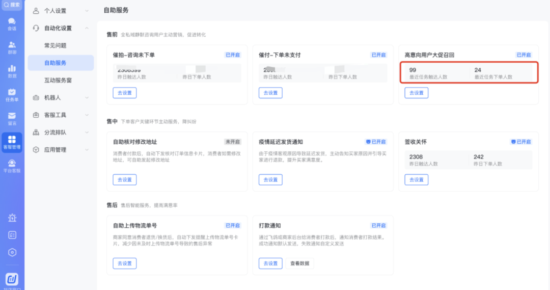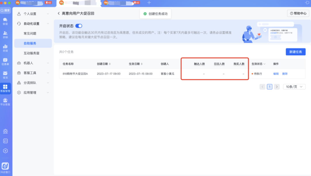 另外在自助服务页面还能够看到近90天所有任务的触达人数和下单人数。
