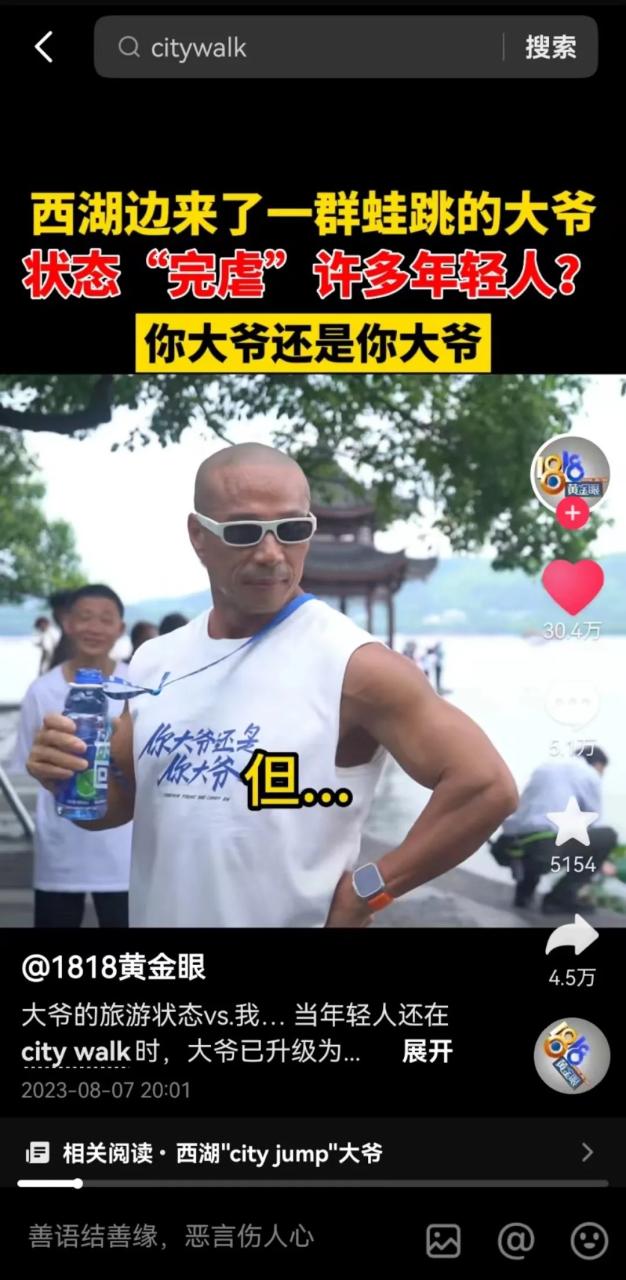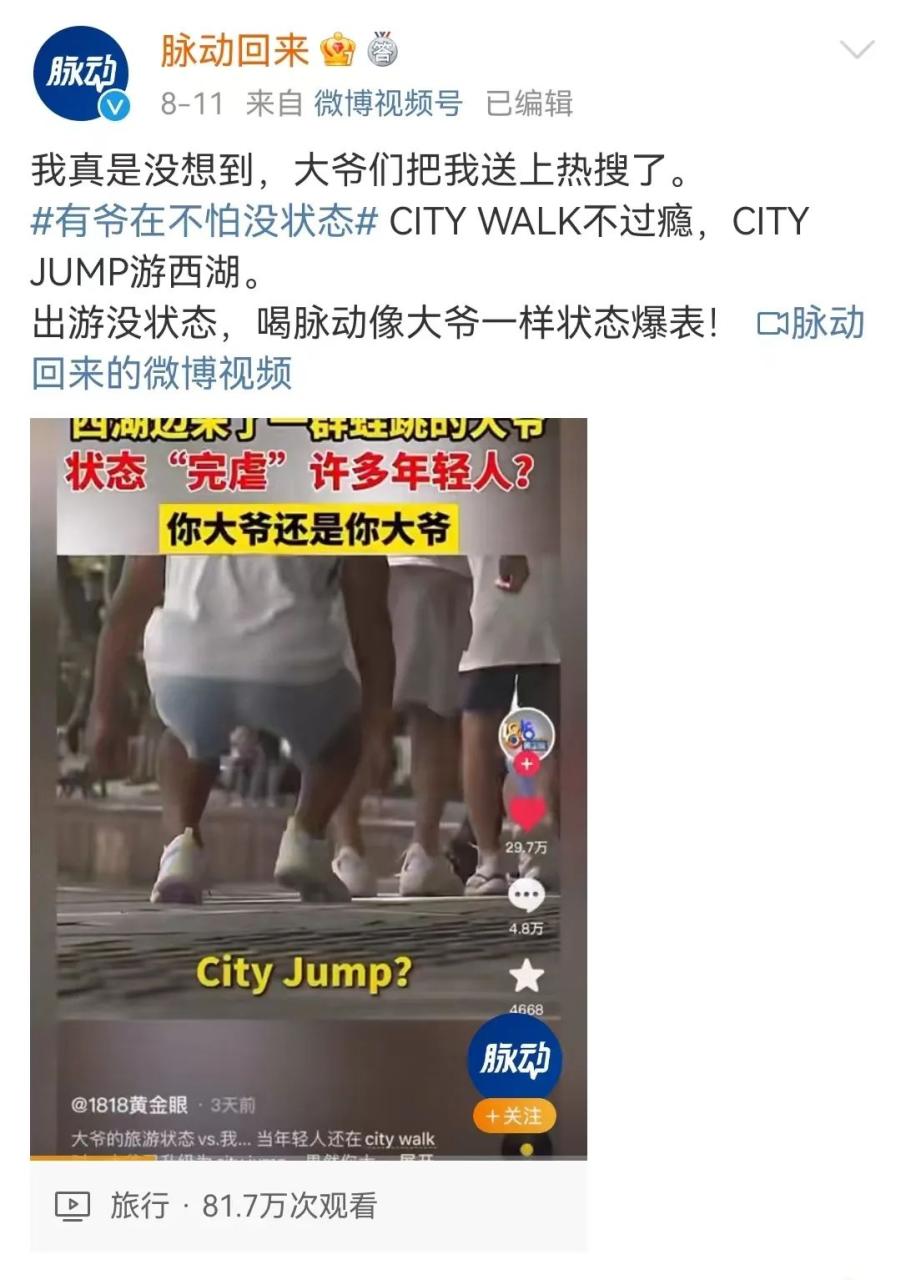 内容上,带动了一波网友衍生city jump的造梗玩梗热潮,被关联进了多个抖音自然热点,如#city walk是什么梗##西湖边大爷已经开始city jump了##当代年轻人的旅游状态#,制造了“city jump”“老年旅游刺客”等多个热词,也让大众对梗的记忆点转化为品牌的记忆点。
