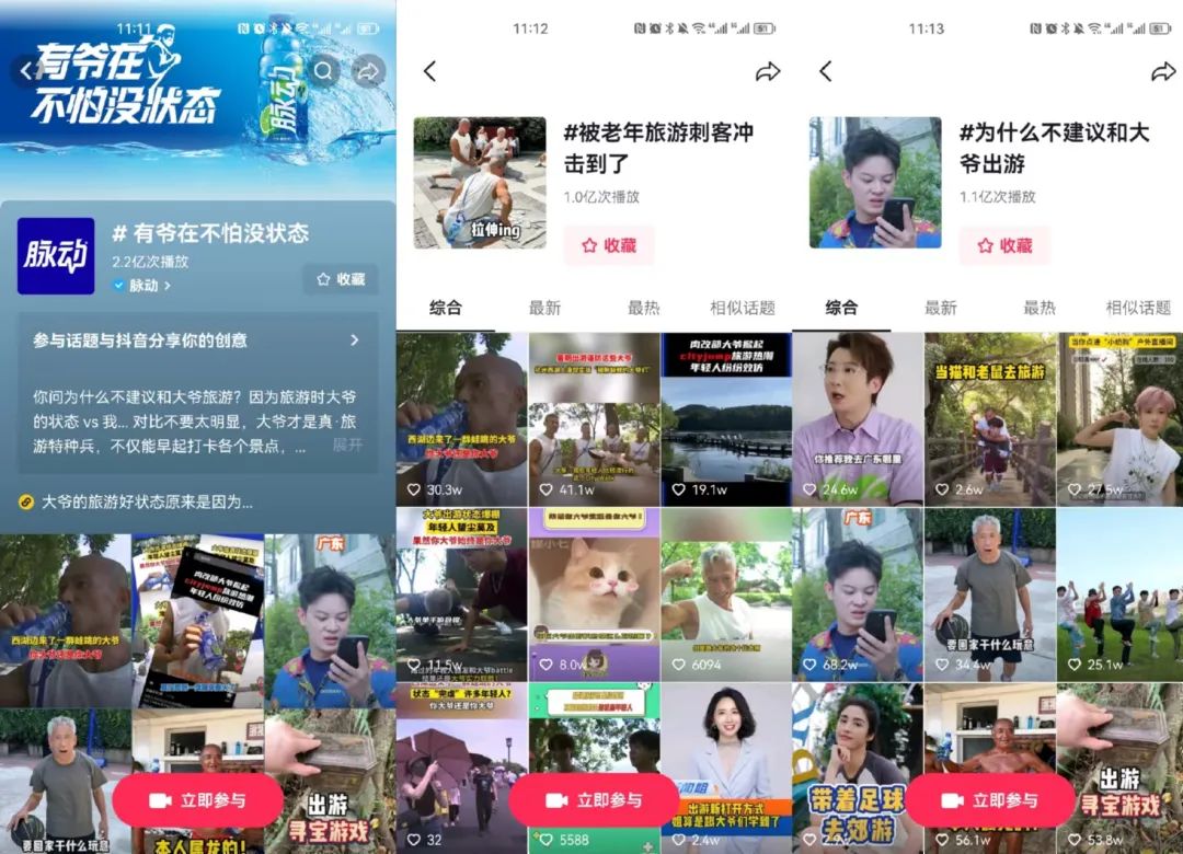 最终实现的传播效果也有目共睹:数据上,#为什么不建议和大爷出游#和#有爷在不怕没状态# 以及#被老年旅游刺客冲击到了# 三个话题截至发稿前已超过4亿+播放量;